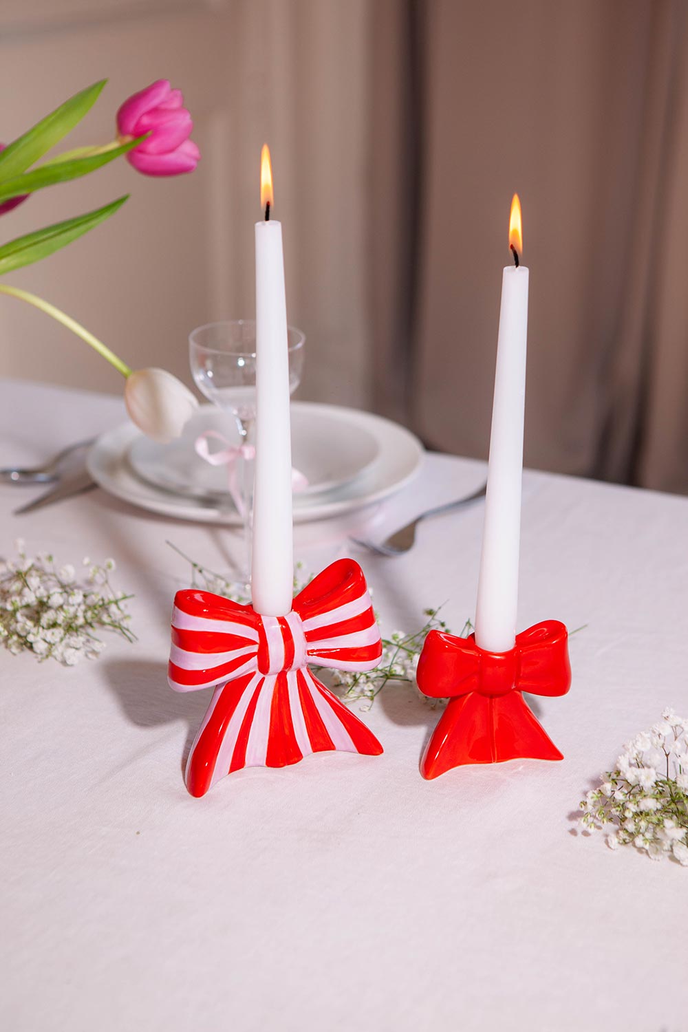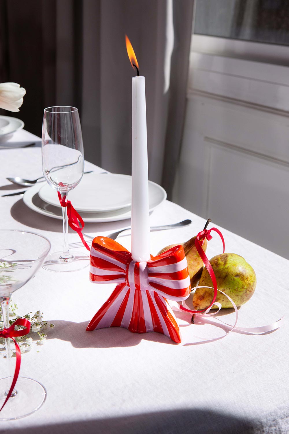 В подсвечнике Bow застыл мимолётный жест балерины или кокетливый намёк. Он словно воплощает в себе хрупкое равновесие между страстью и невинностью. Сочетание смелого алого и чистейшего белого создает динамичный контраст, а лаконичная форма банта раскрывает свою красоту в игре огонька свечи.